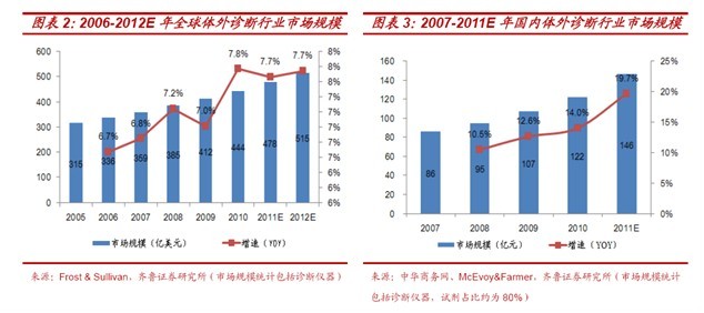 據(jù)McEvoy & Farmer 的市場(chǎng)報(bào)告《中國臨床診斷市場(chǎng)(2011)》預(yù)測(cè),我國體外診斷行業(yè)未來增速有望達(dá)到15%-20%,遠(yuǎn)遠(yuǎn)超過全球5%-7%的增長,至2015 年成為全球第三大市場(chǎng);